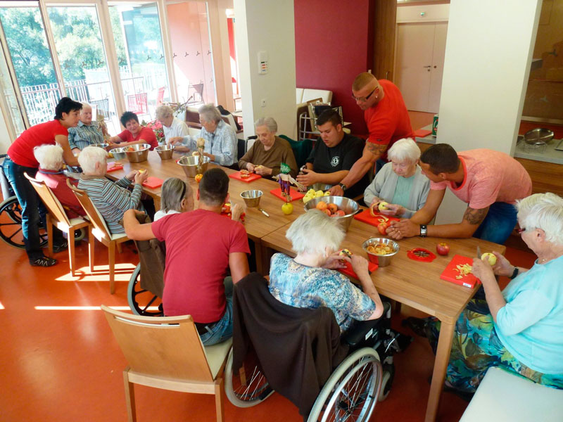 Im Zuge des Projektunterrichts Animation/ Motivation kreierten die Schülerinnen und Schüler gemeinsam mit den Heimbewohnerinnen und Heimbewohnern allerlei Kulinarisches zum Thema Apfel. Unter Anleitung und Hilfestellung der Lernenden wurden Apfelkuchen, Apfelkompott und Tischdekorationen gemeinsam mit den Heimbewohnerinnen und Heimbewohnern gefertigt und bei einer anschließenden Kaffeejause genossen. Im Sinne eines gelungenen Theorie/Praxistransfers konnten die erlernten Inhalte angewendet und umgesetzt werden. Die positive Stimmung unter den Teilnehmerinnen und Teilnehmern unterstrichen die wesentliche Bedeutung des generationenübergreifenden Erlebens! Angesichts der spürbaren Begeisterung konnten die beiden Lehrerinnen Birgit Prosch und Birgit Kubin auf ein gelungenes Projekt zurückblicken.