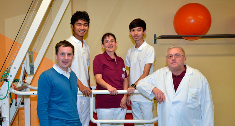 (v.l.) Studiengangsleiter Dir. Prof. (FH) Reinhard Beikircher, Studierender Pinyasak Pasakorn, leitende Physiotherapeutin Gabriele Kreuter, Studierender Norkaew Warathanet und Prim. Dr. Igor Rakitin