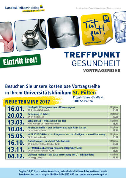 Die Veranstaltung findet am Montag, den 16. Jänner 2017, um 18.30 Uhr, im Haus A, 9. Obergeschoß des Universitätsklinikums St. Pölten, statt. Der Eintritt ist frei. Eine Anmeldung ist nicht erforderlich.