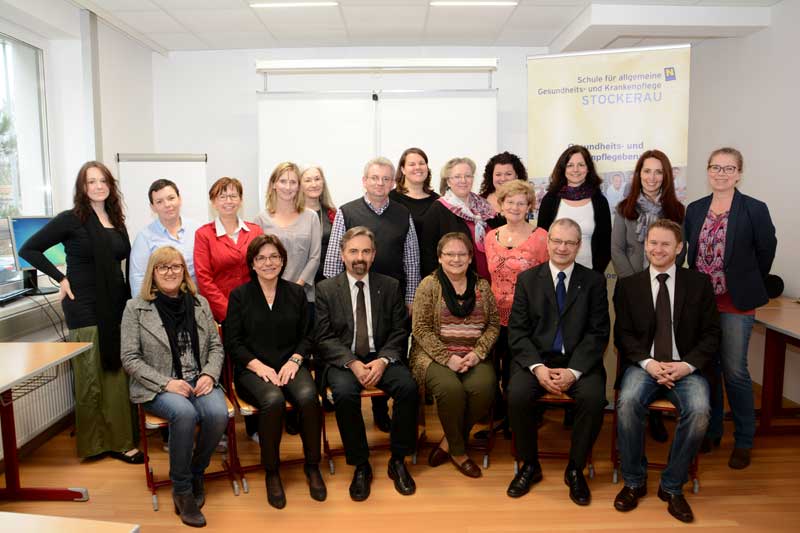 (v.l.) sitzend: Dipl.KH-BW Brigitte Straub, DGKS Maria Bürgmayr, Pflegedirektor DGKP Erich Glaser, interim. Dir. (GuKPS) Ulrike Ruzicka, kfm. Direktor Dipl.-KH-BW Anton Hörth, Ass. Dr. Thomas Laschitz