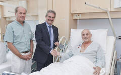 Prim. Univ.-Doz. Dr. Christoph Holzinger, Leiter der Herzchirurgie am Universitätsklinikum St. Pölten, und Landesrat Mag. Karl Wilfing mit dem 15.000sten Patienten Herrn H.
