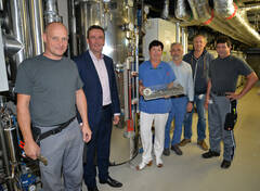 Der Betrieb von Dampfanlagen erfordert viel Know-how von der Instandhaltungsmannschaft des Universitätsklinikums St. Pölten. Hier das Team der Abteilung Technik mit der Leiterin der AEMP vor der Ersatzdampfanlage des Logistikzentrums: (v.l.) Georg Schorm, Professionist, Ing. Christian Müllner, MSc, MBS, Leiter der Abteilung Technik am Universitätsklinikum St. Pölten , Elisabeth Zanghellini, Leitung AEMP, Martin Heindl, Leitung Betriebstechnik, Walter Krainz, Bereichsleitung HKLS, Wolfgang Pichler Professionist