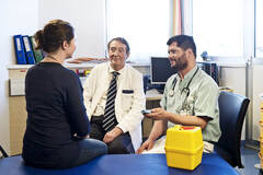 Prim. Univ.-Prof. Dr. Peter Balcke, Leiter der 1. Medizinischen Abteilung am Universitätsklinikum St. Pölten, und Oberarzt Dr. Martin Hofer im Rahmen einer Besprechung der Blutzuckerergebnisse mit einer Patientin