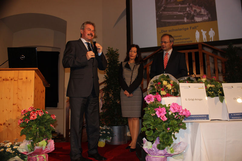 Landesrat Mag. Karl Wilfing, OÄ Dr. Waltraud Stromer und der Ärztliche Direktor des Landesklinikums Horn-Allentsteig Univ.-Prof. Prim. Dr. Martin Breitenseher begrüßen die Besucher des Schmerzkongresses auf der Rosenburg.