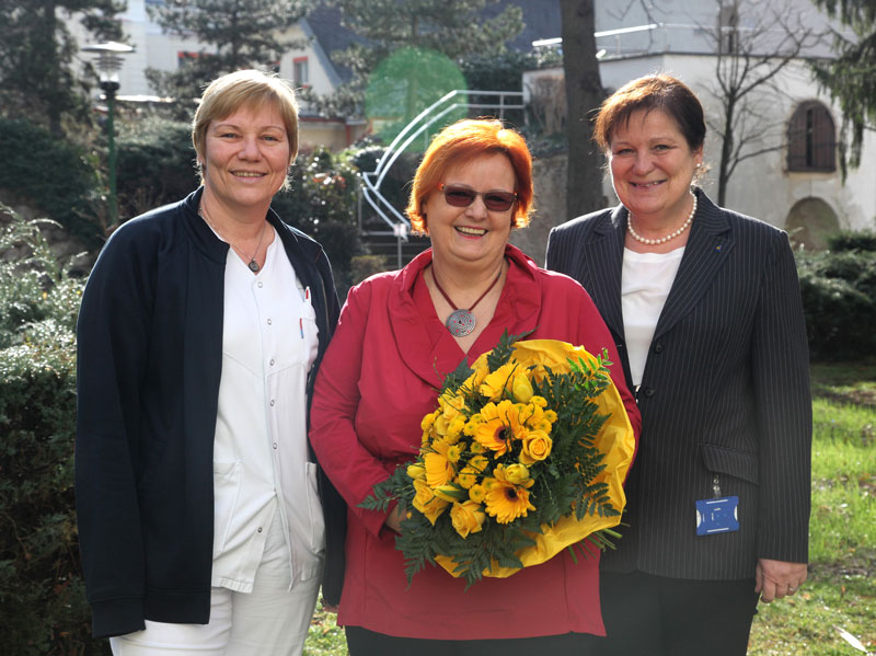 (v.l.) Bereichsleiterin DGKS Claudia Mathae (li) und Pflegedirektorin Dr. Evelyn Fürtinger, MAS, (re) verabschieden sich von der beliebten Mitarbeiterin Pflegehelferin Lydia Bubestinger-Steindl.
