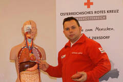 Damit ist es ihm nun gestattet, seine erworbenen, vertieften Fähigkeiten und Kenntnisse unter anderem bei diesen Notfallmanagement-Schulungen an die Kolleginnen und Kollegen im Klinikum weiterzugeben. Diese klinikumsinternen Fortbildungen beinhalten neben einem theoretischen Vortrag samt medienunterstützer Präsentation auch praktische Übungen. OP-Gehilfe Markus Hofmann: „Bei der Ausbildung zum Lehrsanitäter musste ein fachlicher Check durch Lehrpfleger des Landesverbandes des NÖ Roten Kreuzes positiv abgeschlossen werden. Dieser umfasste die komplette Sanitätshilfe in Theorie und Praxis. Zusätzlich gab es ein mehrtägiges Seminar und ein 40-Stunden-Coaching.“