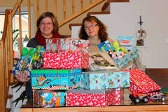 (v.l.) Sonja Schöberl, Leiterin der Sammelstelle Eggendorf, und Petra Zanitzer unterstützen die Aktion „Weihnachten im Schuhkarton“.