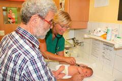Das Weinviertler System der Turnusärzterotation läuft gut. Im Bild (v.l.) Prim. Univ.-Prof. Dr. Hans Salzer und Turnusärztevertreterin Dr. Adrienne Majan bei der Untersuchung von Baby Benedikt
