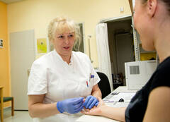 Stoffwechsel-Ambulanz Leiterin DGKS Annemarie Mück bei der Blutzuckermessung