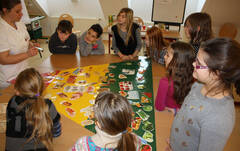 Die Kinder befüllen die Ernährungspyramide gemeinsam mit Diätologin Katharina Youssef.
