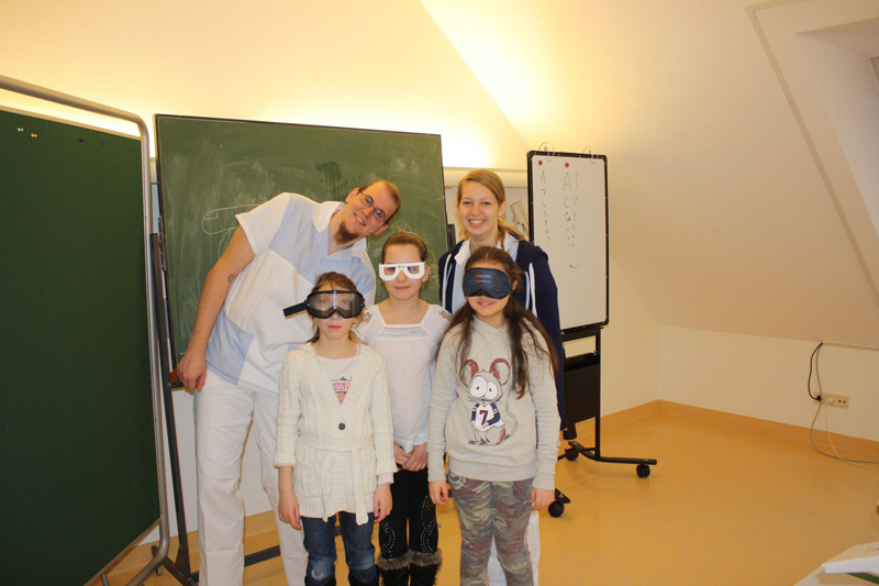 Mathias Arthaber und Verena Novotny testen mit den jungen Besuchern visuelle Beeinträchtigungen wie Tunnelblick und extreme Kurzsichtigkeit.