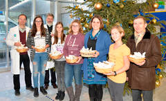 Übergabe Weihnachtsengel im Universitätsklinikum St. Pölten: Europamittelschule Prinzersdorf (v.l.) Mag. Max Hiebner, Anna Schuster, Pfarrer Kurt Schrattmaier, Adriana Prunean, Emma Stern, Religionslehrerin Karin John-Redlingshofer, Franziska Schuster, OSR Karl Mondl, Direktor der Europamittelschule Prinzersdorf
