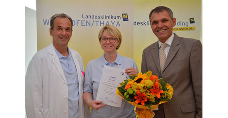 Mit ausgezeichnetem Erfolg und einem Notendurchschnitt von 1,0 schloss DGKS Petra Schneider, beschäftigt im OP des Landesklinikums Waidhofen/Thaya, den Universitätslehrgang „Basales und Mittleres Pflegemanagement“ ab und bekam die Bezeichnung „Akademische Pflegemanagerin“ verliehen.