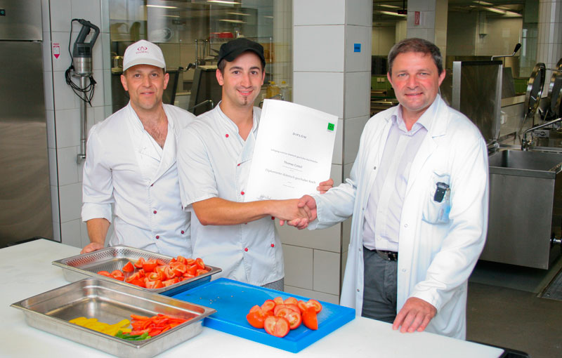 Johannes Steininger, stellv. Küchenleiter, und Dipl. KH-BW Franz Waldecker, Kaufm. Standortleiter, gratulieren Thomas Grötzl zur Absolvierung des Lehrgangs zum diätetisch geschulten Koch.