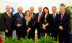 Für ihre Verdienste verlieh die Donau-Universität Krems an Dr. Peter Gausmann und Daniele Marcelli, MD, den Titel Ehrenprofessor sowie den Titel Ehrensenator an KR Ing. Hans-Werner Frömmel. (v.l.): Univ.-Prof. Dr. Anton Leitner, MSc, Vorsitzender des Senats der Donau-Universität Krems, KR Ing. Hans-Werner Frömmel, Univ.-Prof. Dr. Viktoria Weber, Dr. Peter Gausmann, Daniele Marcelli, MD, Arch. Dipl.-Ing. Dr. techn. Renate Hammer, MAS, Dekanin der Fakultät für Bildung, Kunst und Architektur der Donau-Universität Krems, Dipl.-Ing. Dr. techn. Peter Holzer, Leiter des Departments Bauen und Umwelt der Donau-Universität Krems, Univ.-Prof. Dr. Dieter Falkenhagen, Leiter des Departments für Gesundheitswissenschaften und Biomedizin. (Foto: DUK/Reischer)