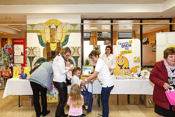 Man konnte auch selbst aktiv werden: mit einem Gesundheitstest in der „Gesundheitsstraße“, wo Momentaufnahmen der Stationen Blutdruck, Blutzucker, Body Mass Index und Cholesterin gemacht wurden und direkt in den persönlichen Gesund + Fit-Pass eingetragen wurden. Auch für die jüngsten Besucher gab es wieder zahlreiche Aktivitäten: Neben Schalen aus Gips die die Kinder formten und anschließend bunt bemalten, wurden auch lustige Tierfiguren aus Luftballons gemacht.