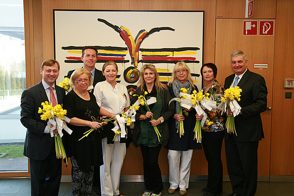 Blumengrüße im Universitätsklinikum St. Pölten: (v.l.) Nationalratsabgeordneter Mag. Fritz Ofenauer, Vizebürgermeister Ing. Matthias Adl, Betriebsrätin Dipl. KH-BW Jacqueline Brandstetter, Landtagsabgeordneter Dr. Martin Michalitsch, Bianca Hauer, stellvertretende Pflegedirektorin, Ing. Christian Müllner, MSc, MBA, stellvertretender Kaufmännischer Direktor