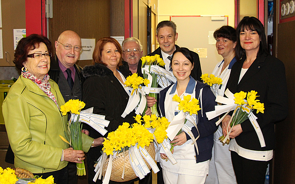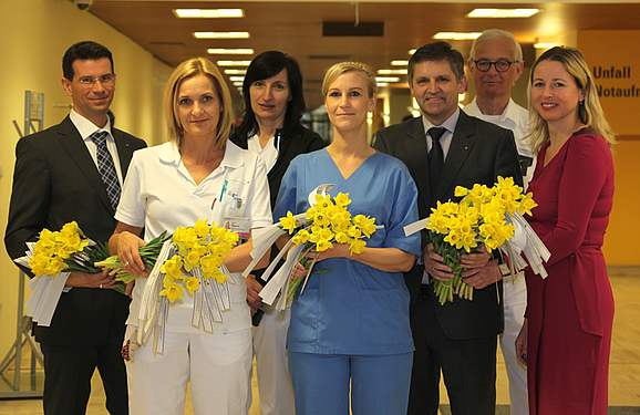 Der Valentinstag, ein Tag, an dem man seinen Mitmenschen seine Wertschätzung ausdrückt, so auch im Landesklinikum Wiener Neustadt: Sabine Neubauer und Hermine Blaha freuten sich über den Blumengruß von Bundesrat Martin Preineder, Mag. (FH) Herbert Karner, Landtagsabgeordneten Ing. Franz Rennhofer, Dr. Evelyn Fürtinger, MAS, und Prim. Univ.-Doz. Dr. Paul Christian Hajek
